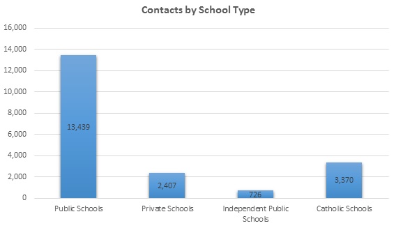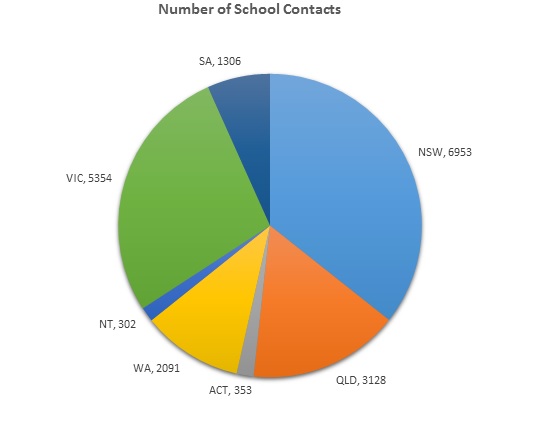 The graph above shows the breakdown of Australian school contacts by Public, Private, Independent Public and Catholic schools.